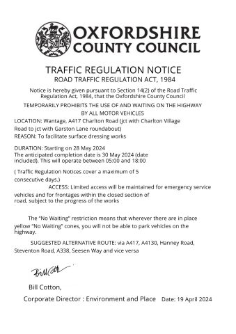 TTRO (T13793) Temporary Road Closure and No Waiting – Wantage, A417 Charlton Road Published on 22 April 2024